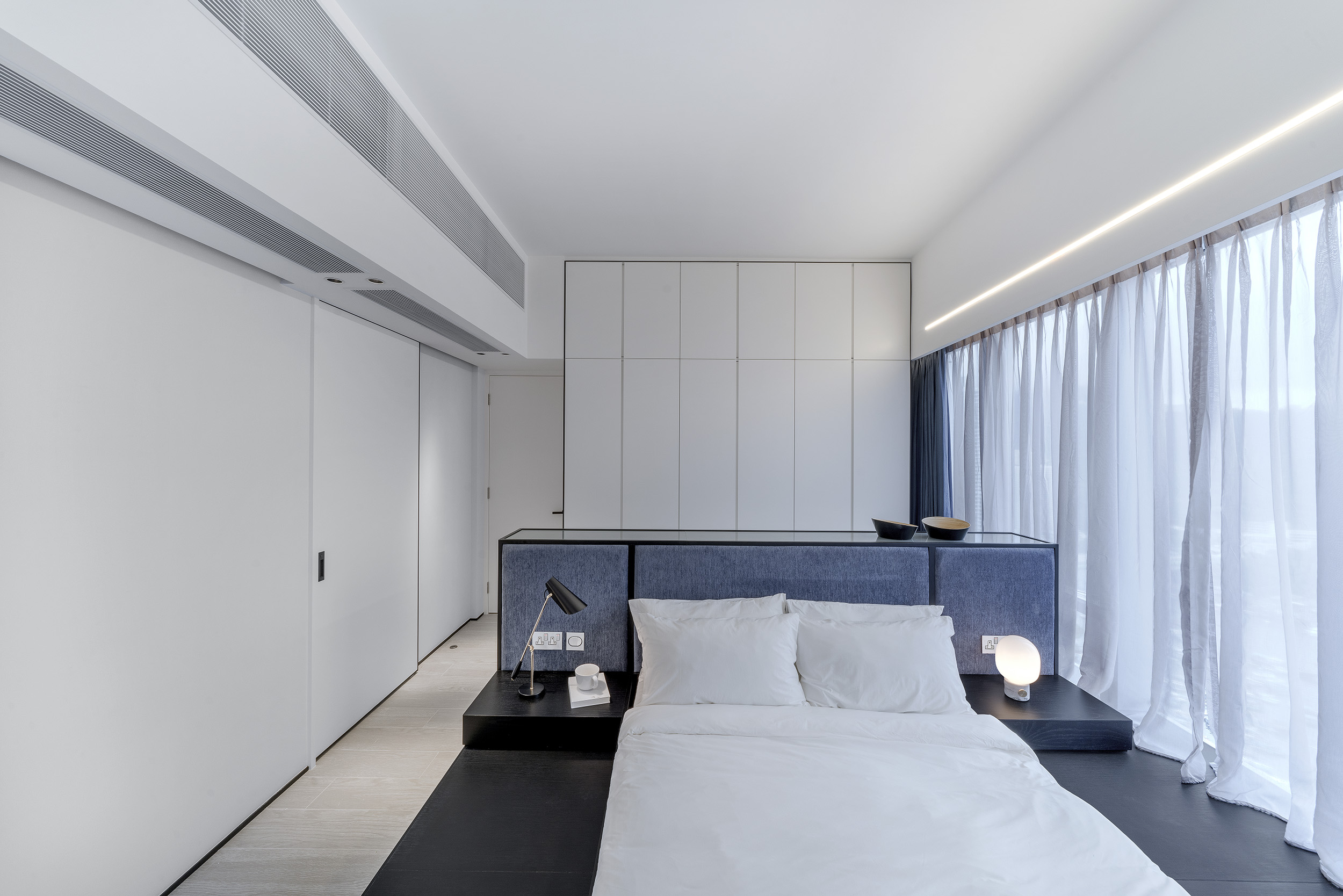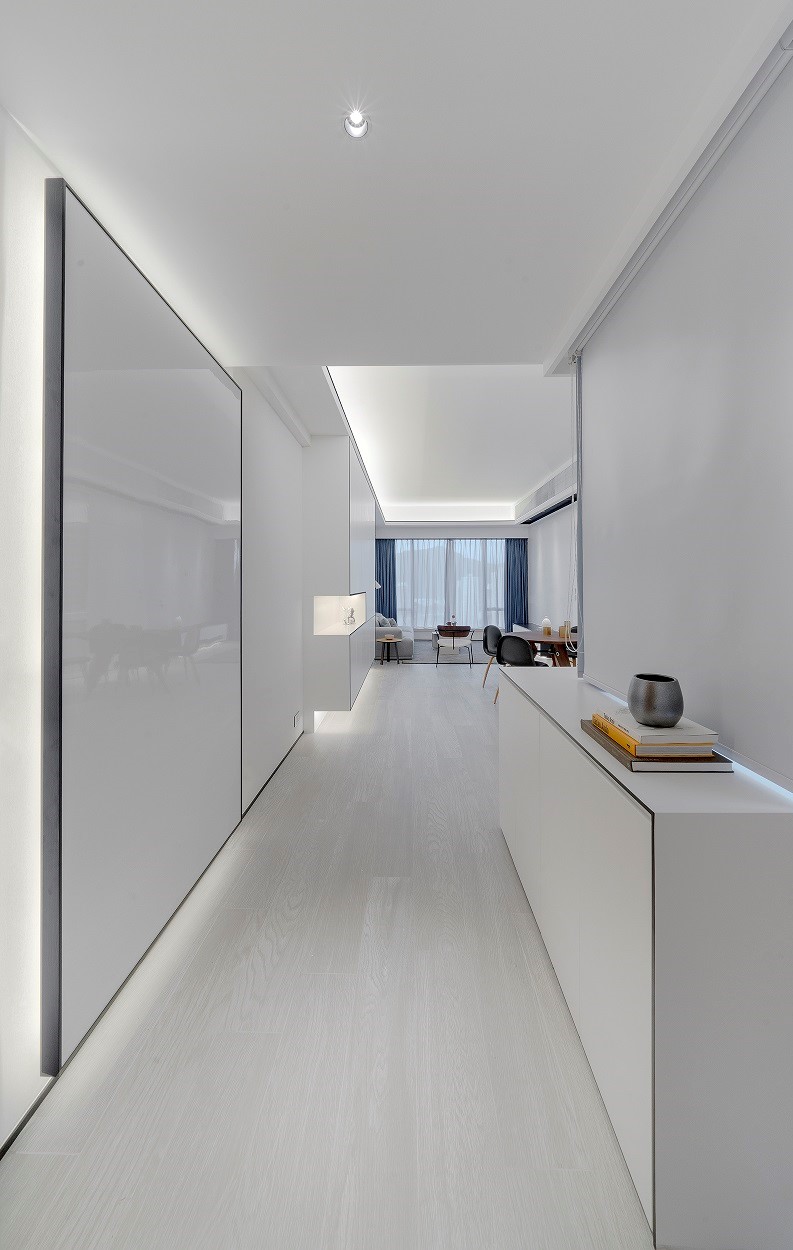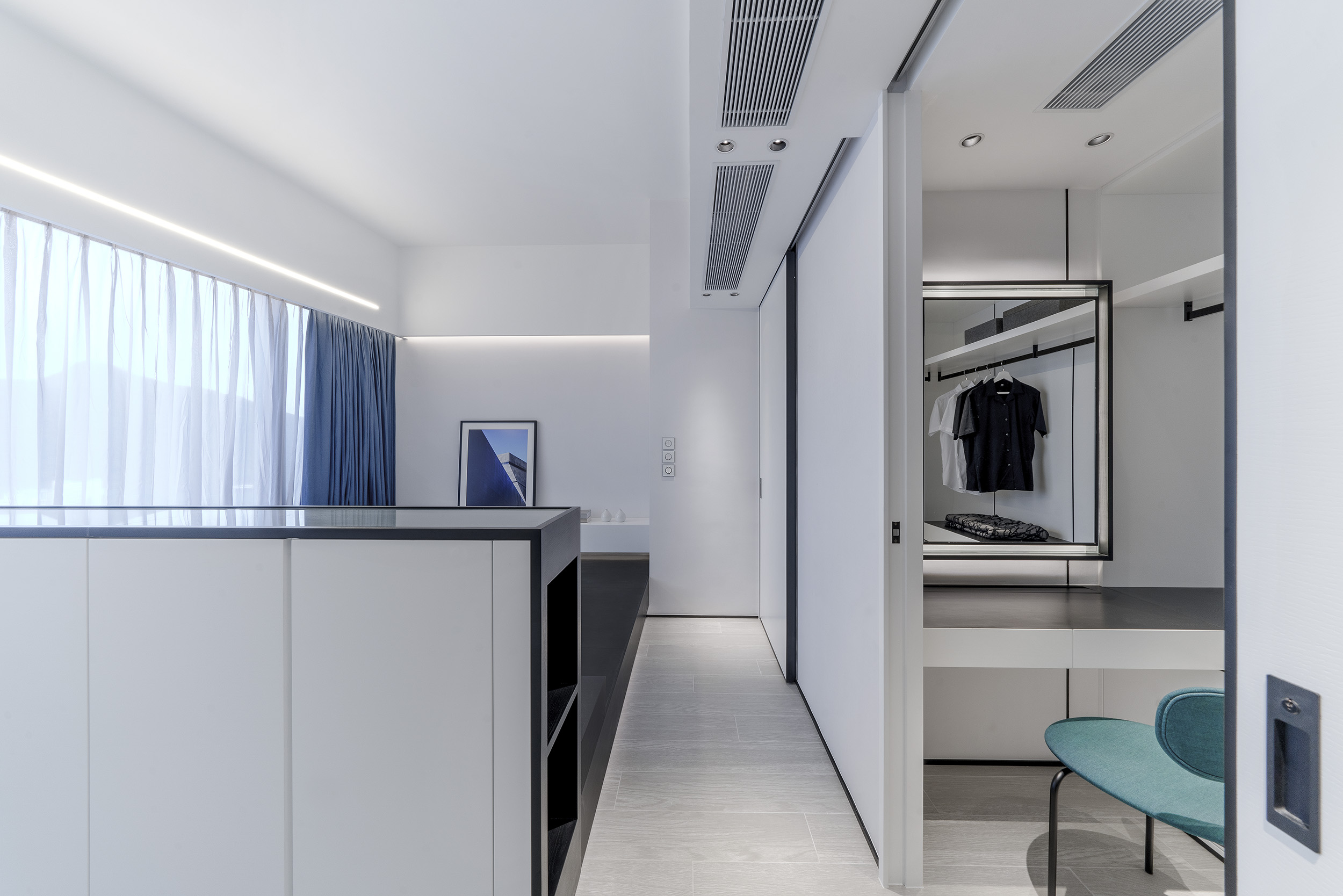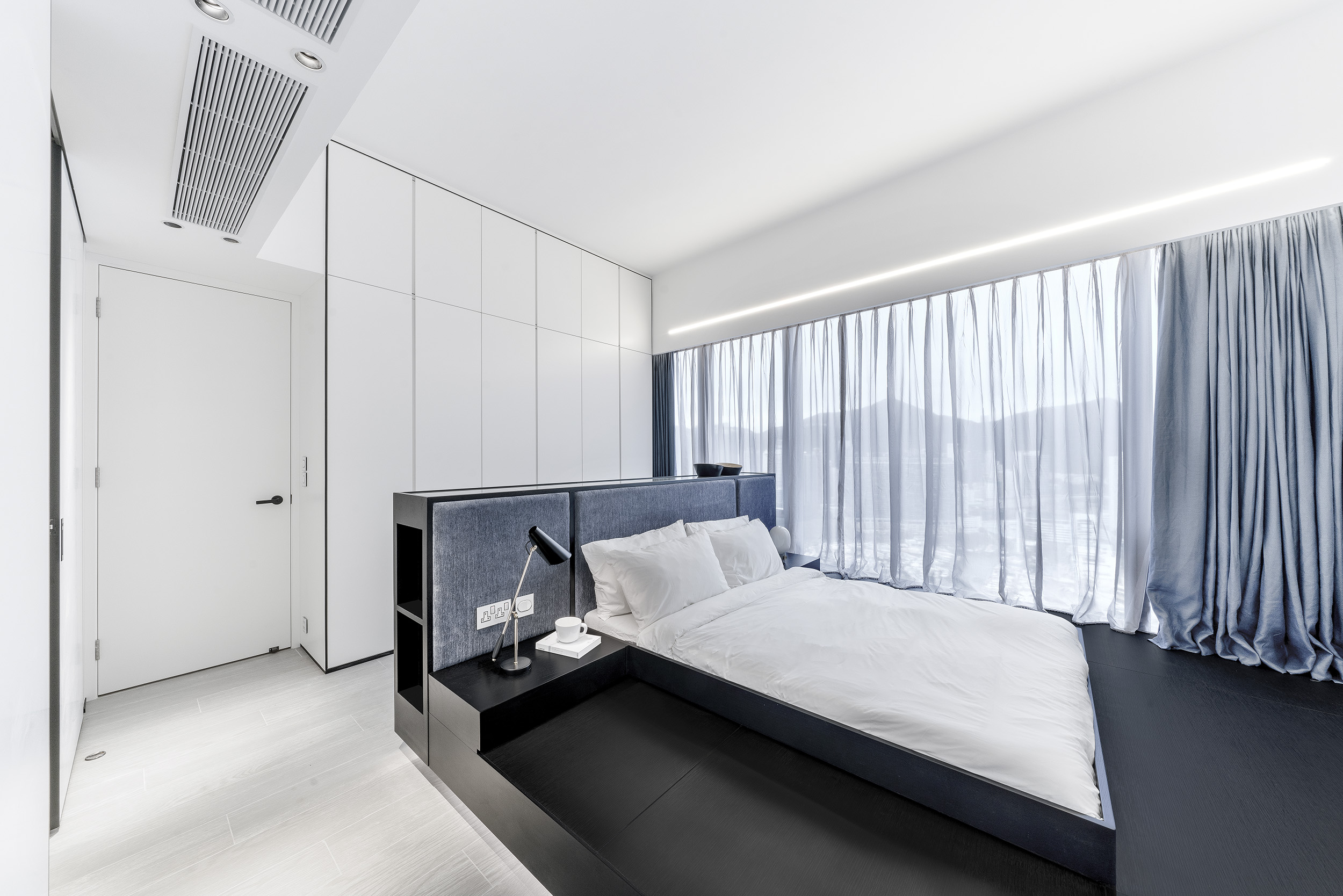 The unit uses pure white tones, ultimate design details with natural materials with minimalist spatial design to create a simple design for the more gentle and pressureless atmosphere. Using black wooden lines around the storage cabinet, ceiling and wall, the contrasting lines look like a frame in different perspectives of the unit, adding a lot of visual impacts and creating a layered effect.