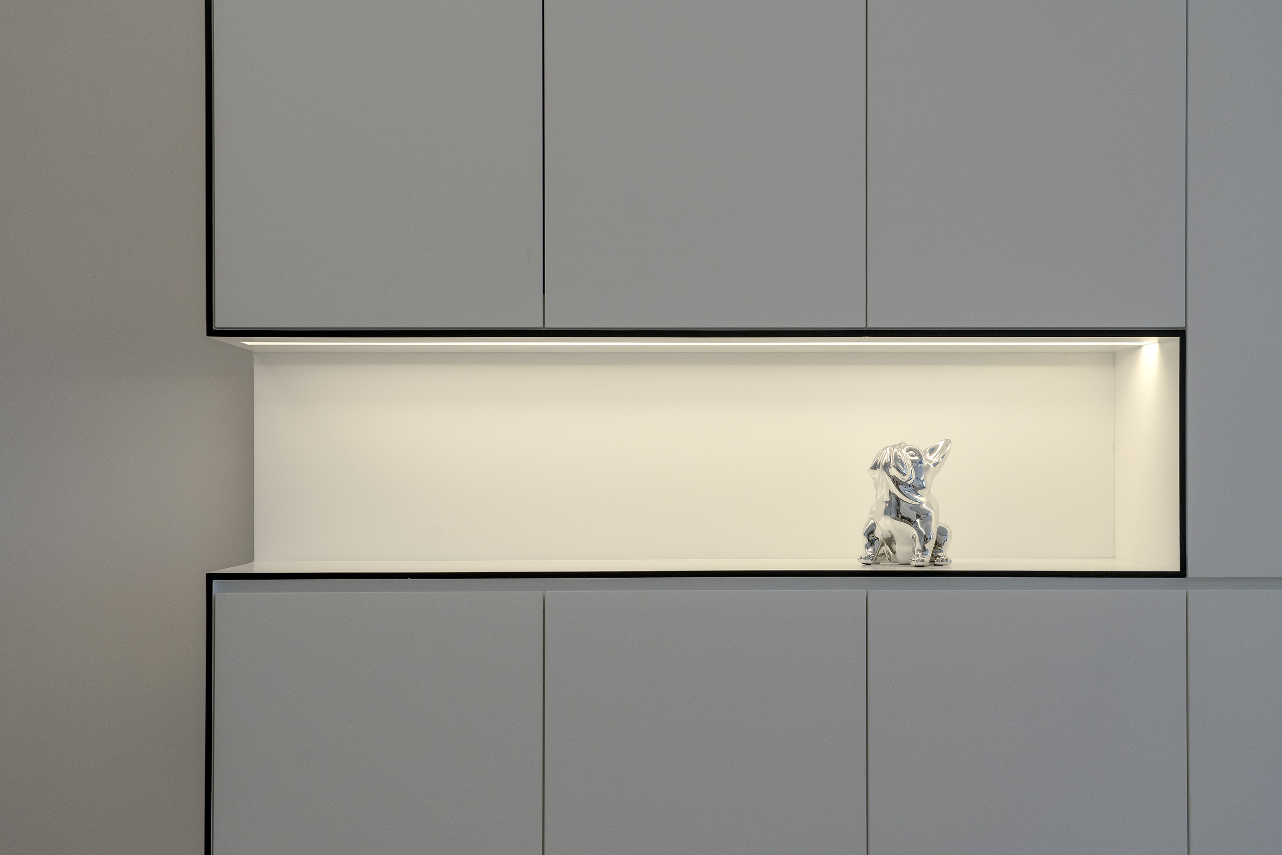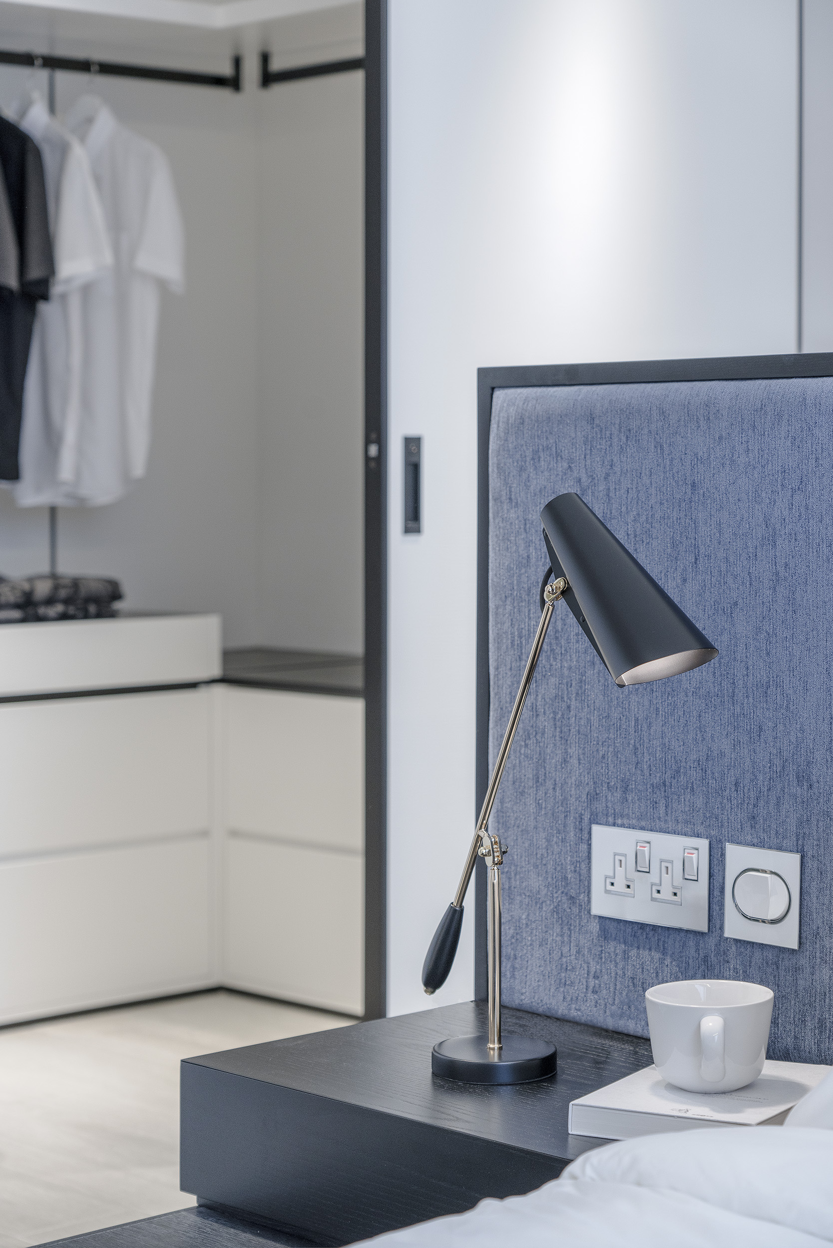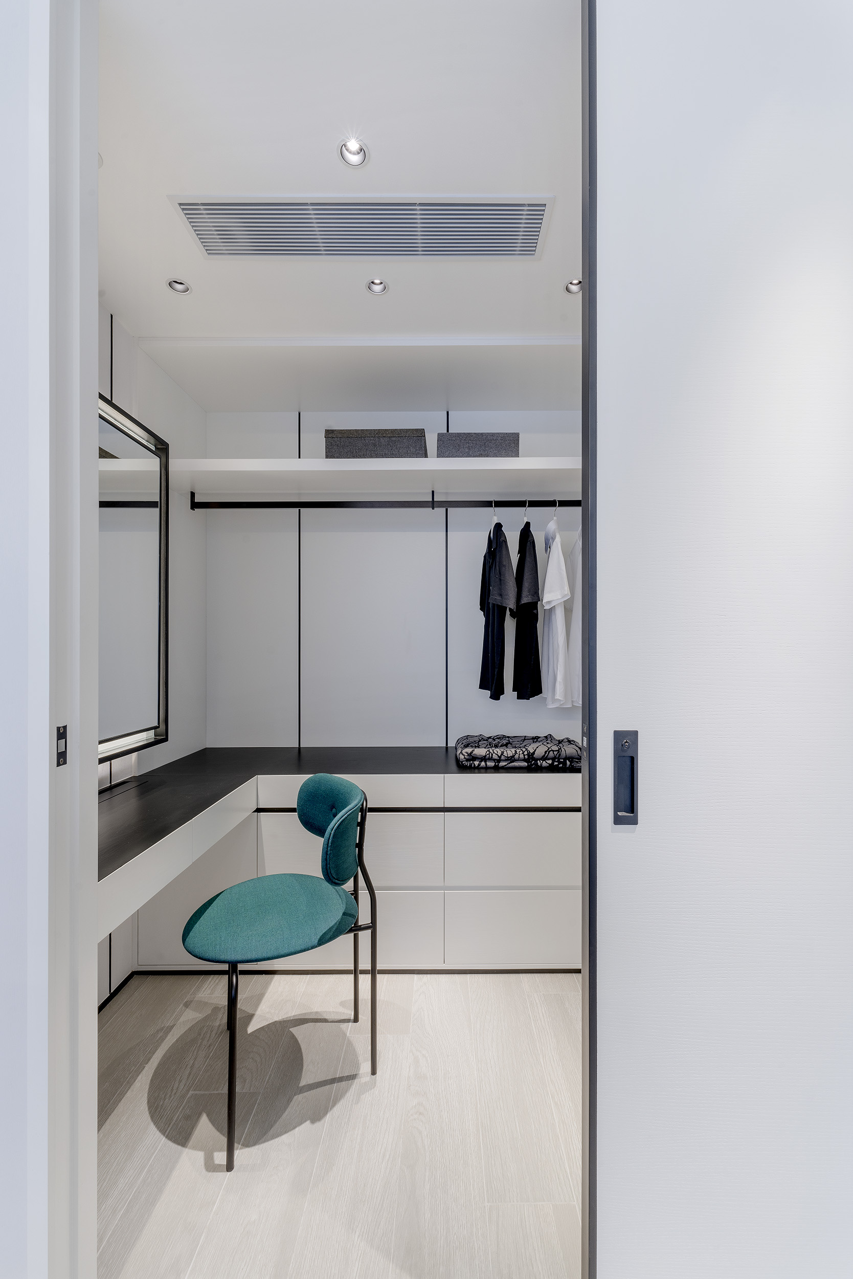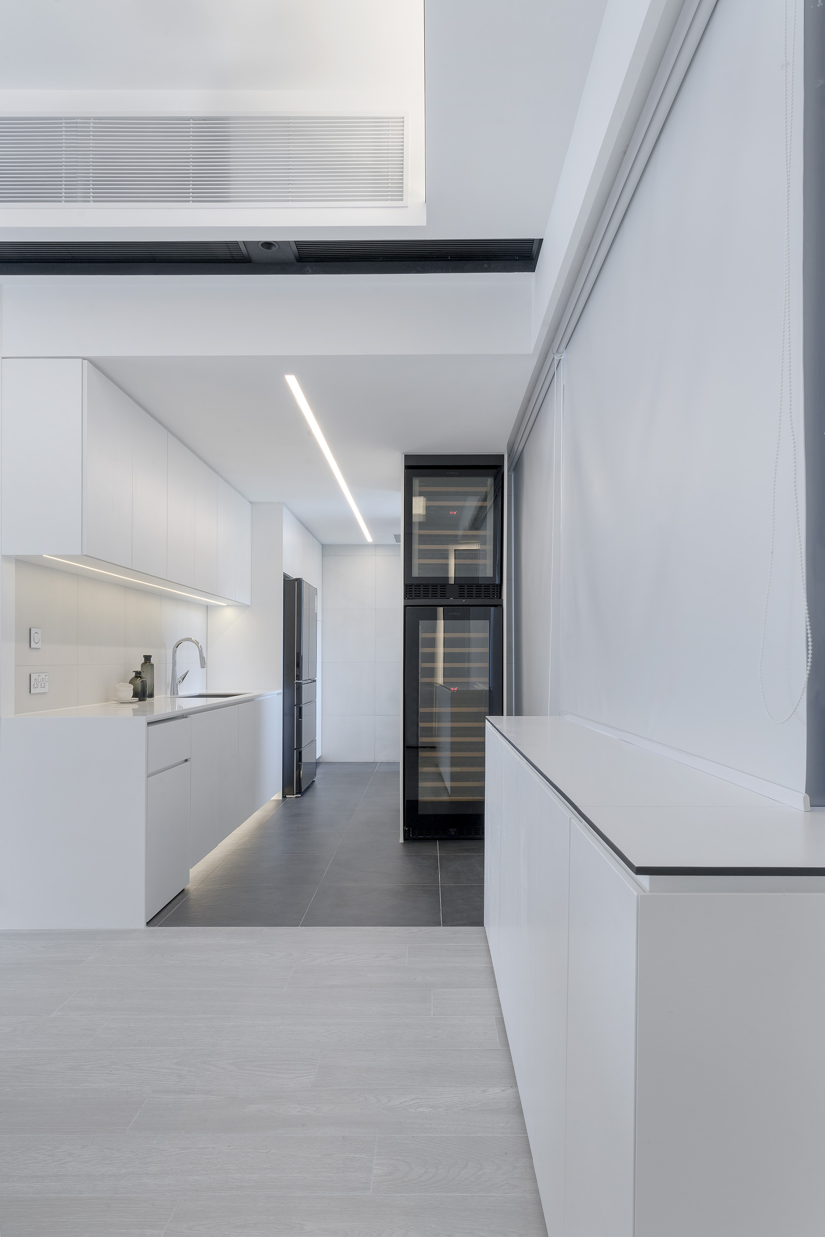 The unit uses pure white tones, ultimate design details with natural materials with minimalist spatial design to create a simple design for the more gentle and pressureless atmosphere. Using black wooden lines around the storage cabinet, ceiling and wall, the contrasting lines look like a frame in different perspectives of the unit, adding a lot of visual impacts and creating a layered effect.